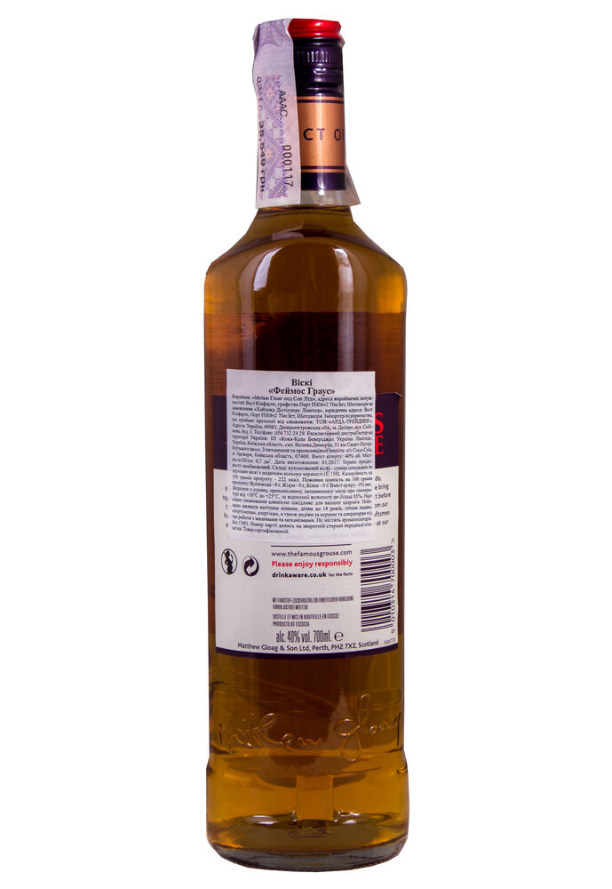 Состав и Технология: "The Famous Grouse" создается с использованием различных видов шотландского солода и зернового спирта. Виски выдерживается в дубовых бочках, что придает ему характерные вкусовые оттенки.