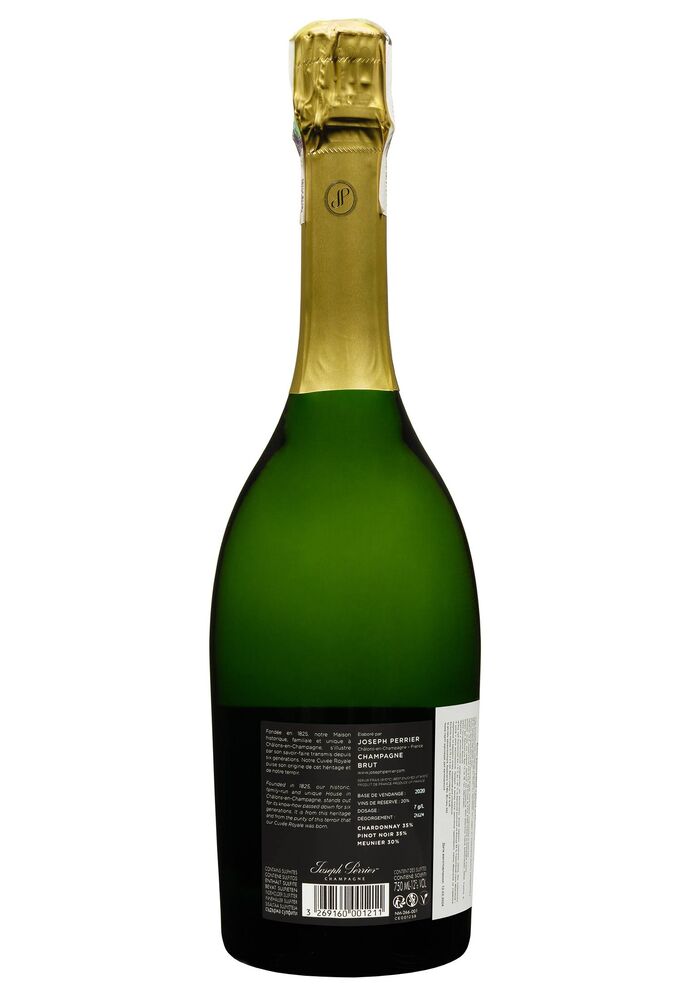 Joseph Perrier Cuvee Royale Brut створюється з класичних сортів винограду: Шардоне, Піно Нуар і Піно Меньє, вирощених на найкращих виноградниках регіону Шампань. Виноград ретельно відбирається і проходить повільний процес ферментації за контрольованої температури. Вторинна ферментація відбувається безпосередньо у пляшках, що дозволяє шампанському розвивати свої унікальні характеристики протягом кількох років витримки на осаді.