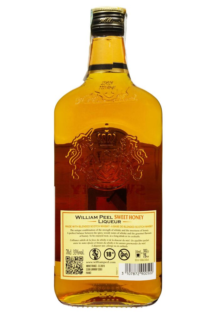 Виробництво: William Peel Sweet Honey виготовляється з кращих сортів зернових та солодових віскі, які витримуються у дубових бочках для досягнення ідеального балансу смаку. Після цього віскі збагачується натуральним медом, що надає йому солодкість та м'якість. Кожен етап виробництва контролюється досвідченими майстрами, щоб гарантувати найвищу якість кінцевого продукту.