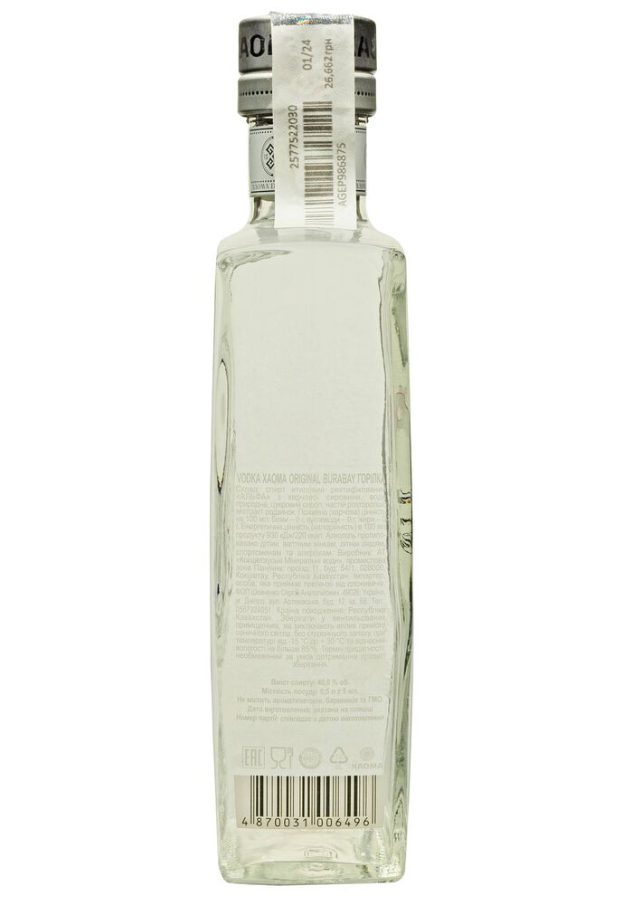 Производство: Для производства Xaoma Original Burabay используется высококачественное зерно и вода, прошедшая многоступенчатую фильтрацию. Технологический процесс включает несколько стадий дистилляции и фильтрации, что придаёт водке исключительную мягкость. Особенностью является добавление природных экстрактов, что делает этот продукт уникальным.