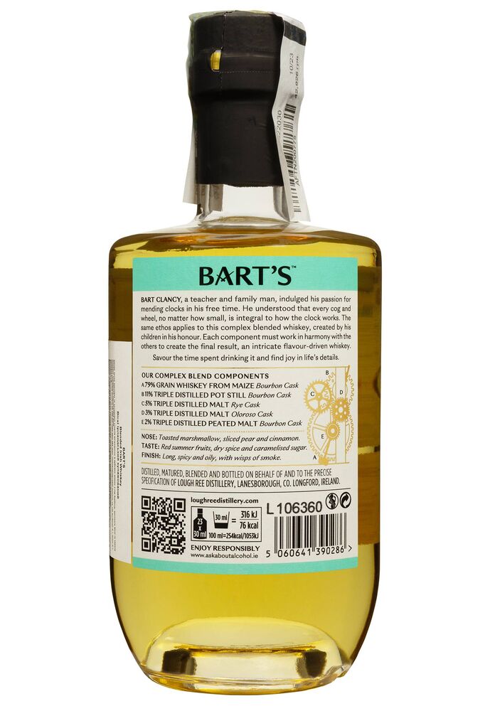 Bart’s Irish Whiskey — первый купажированный продукт винокурни Lough Ree. Назван в честь Барта Клэнси, отца основателей Питера, Шейлы и Майка, этот виски воплощает преданность деталям, подобно часам, над которыми Барт трудился с любовью. Каждый элемент этого виски имеет важную роль, создавая сложный и гармоничный купаж.
