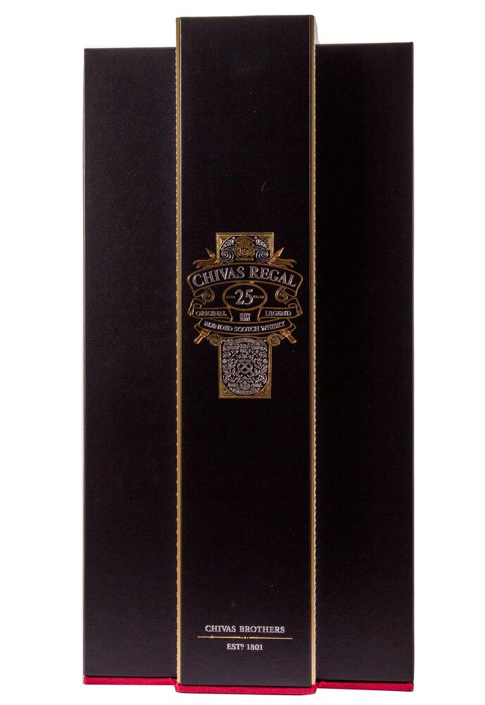 Chivas Regal 25 y.o. представлен в элегантной упаковке, которая сочетает в себе традиции и современный стиль. Это искусство упаковки подчеркивает эксклюзивность и уникальность данного виски.